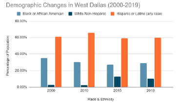 The demographic characteristics of West Dallas have also changed over time, but has consistently been a majority non-White neighborhood, with the majority of residents identifying as Hispanic or Latino.