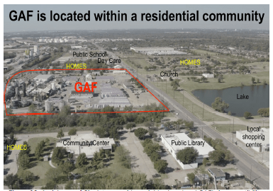 Despite the City of Dallas’ best efforts, the Singleton Corridor neighborhood continues to host many residential homes, multiple public schools and day care centers, as well as community recreation centers. The aerial view below shows the homes and public spaces immediately surrounding GAF and illustrates the size of the facility that is embedded within the heart of a residential community.