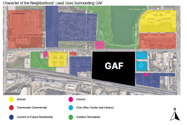 The map below illustrates the current land uses in the neighborhood and the deeply incompatible nature of the GAF facility in the context of the rapidly growing residential and commercial neighborhood.