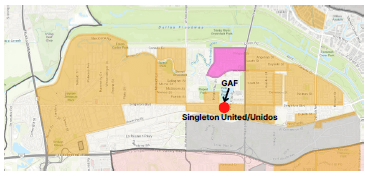 There are three residential areas that comprise the neighborhood where GAF is located: Bedford to the west, the Multipurpose Center area to the east, and Kingbridge Crossing Dallas Housing Authority homes to the north. These three areas in addition to a residential neighborhood (Muncie) further east, make up the Singleton United/Unidos neighborhood. There are several other neighborhoods in West Dallas that are within 1 mile of GAF including Ledbetter/Eagleford, Westmoreland Heights, Greenleaf Village and Victory Gardens.