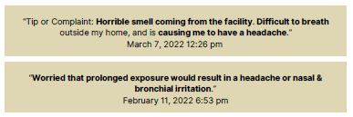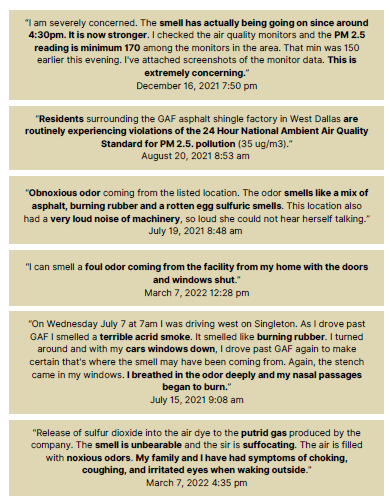 GAF has a four-decade long history of complaints about “burning match” “rotten egg” or just “asphalt” odors that reflect the prevalence of its Sulfur Dioxide pollution along the Singleton Corridor.