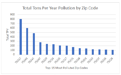 In 2020, Paul Quinn College’s Urban Research Initiative published a landmark report that used EPA and State air pollution inventory data to rank the most polluted Zip Codes and Council Districts. West Dallas’ 75212 Zip Code and City Council District 6 ranked as the most polluted in Dallas. It ranked 2nd in most PM pollution and 1st in releasing the most Volatile Organic Compounds.