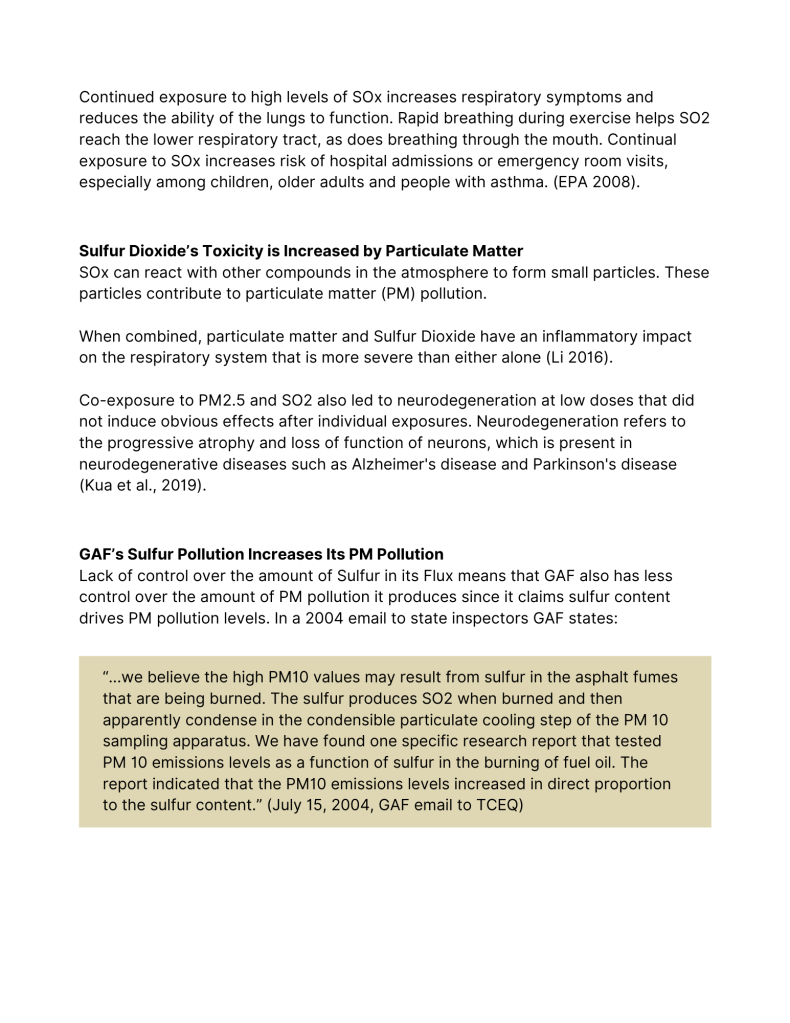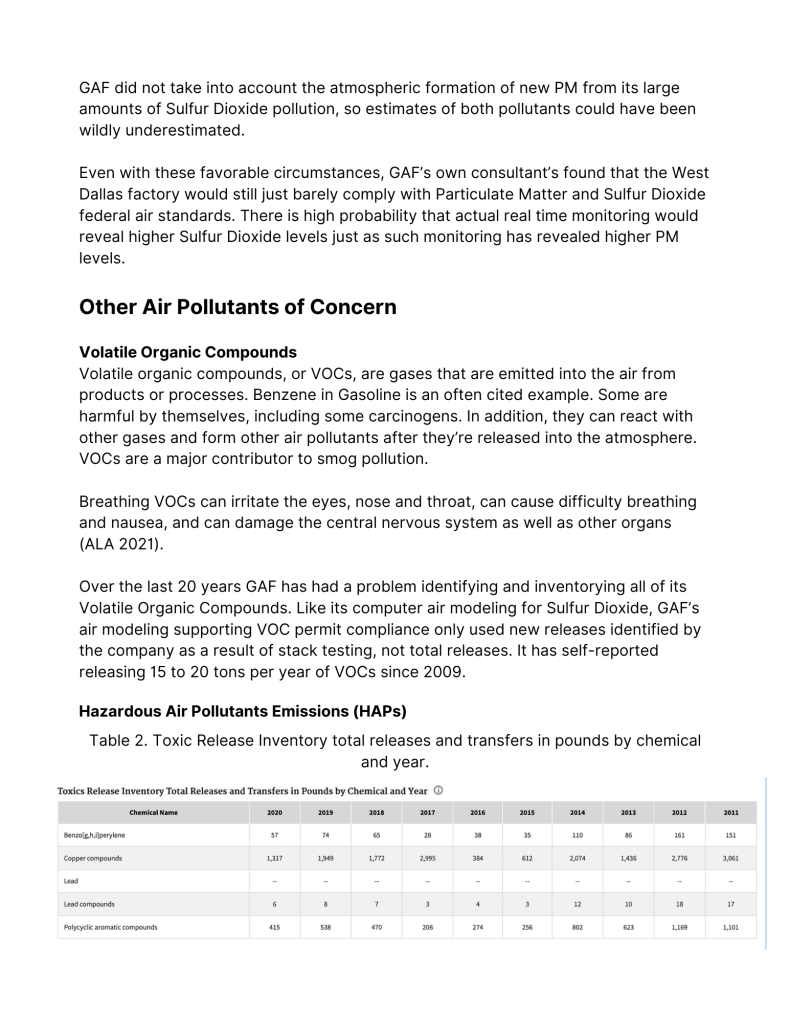 Documented levels of PM pollution around GAF have exceeded all of the revised WHO standards as well as the proposed EPA standards, much less the current EPA standard. West Dallas has a chronic PM pollution problem. GAF is West Dallas’ largest PM polluter – by far. Removing it as a source would decrease ambient PM levels significantly in the neighborhood surrounding the factory.