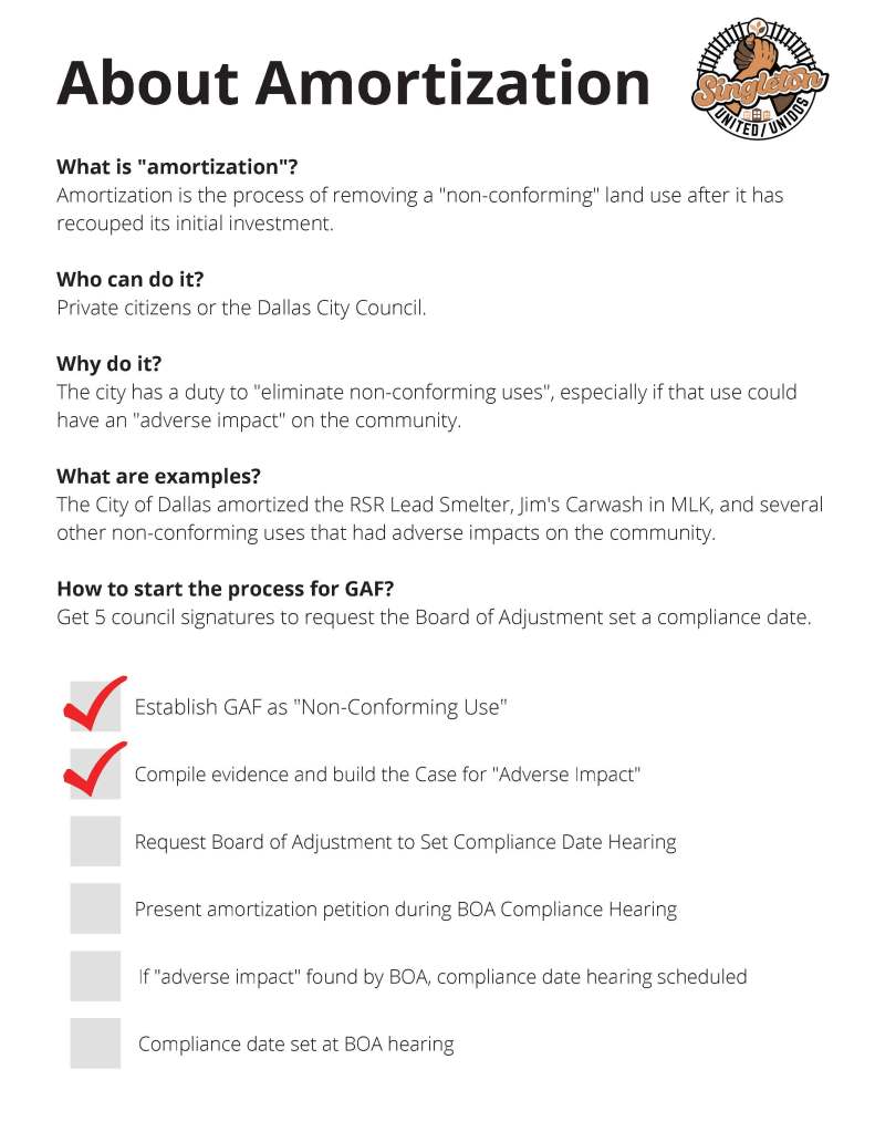 In the context of zoning regulation, “amortization” is a term used to describe the process whereby a compliance date is set for the end of the nonconforming use. Upon a request to establish a compliance date, the Board of Adjustment holds a hearing to determine whether the continued operation of the nonconforming use will have an adverse effect on nearby properties. If it is determined to have an adverse effect, then the compliance date is set to allow for a plan where the owner’s actual investment in the use before the time that the use became nonconforming can be amortized within a definite time period. The nonconforming use ordinance sets forth the relevant factors used in setting the definite time period. Sec. 51A-4.704.